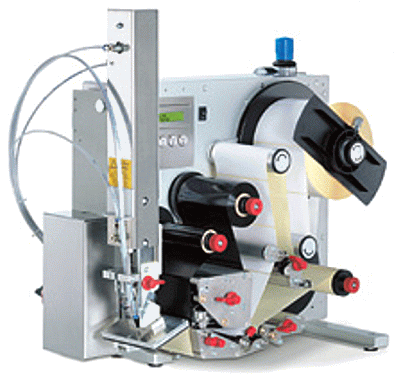 na tlak. Během pracovního cyklu aplikátoru může zůstat polepovaný předmět v klidu na pevné předem definované pozici nebo může být v rovnoměrném pohybu. Polepované předměty musí mít stejnou výšku. Foukací hlava s přisátou vytištěnou etiketou se vystaví do vzdálenosti cca 10 mm od polepovaného předmětu a tlakovým vzduchem foukne etiketu na polepovaný předmět. Foukací hlava se vyrábí pro daný rozměr etikety podle přání zákazníka. |
